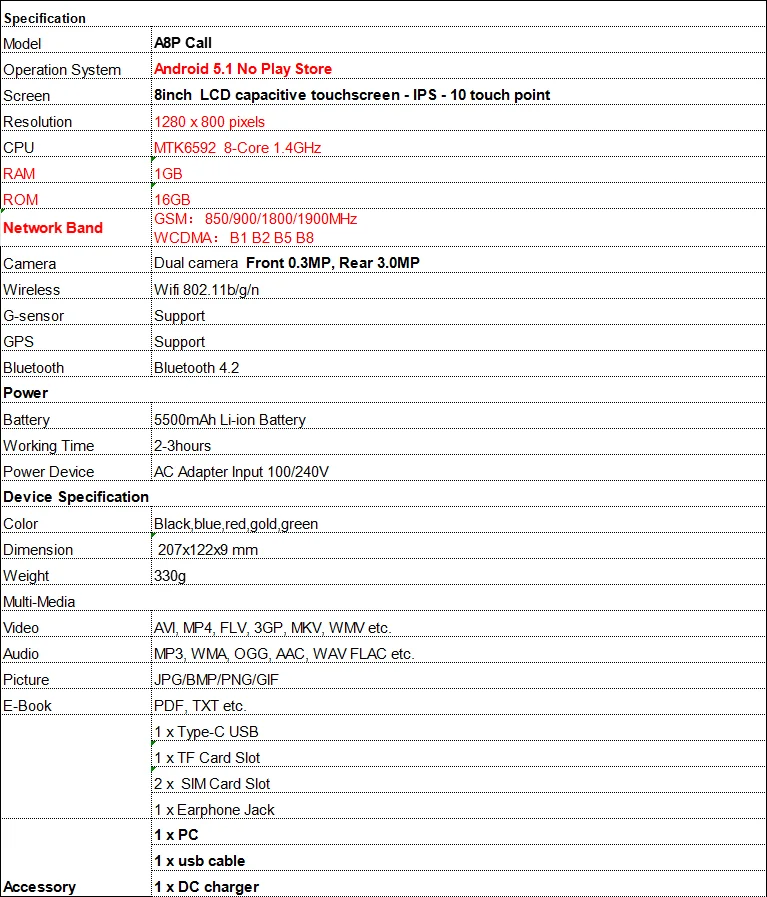 Extend Port: 3G External,Earphone Jack,TF card,Type-C,Micro USB