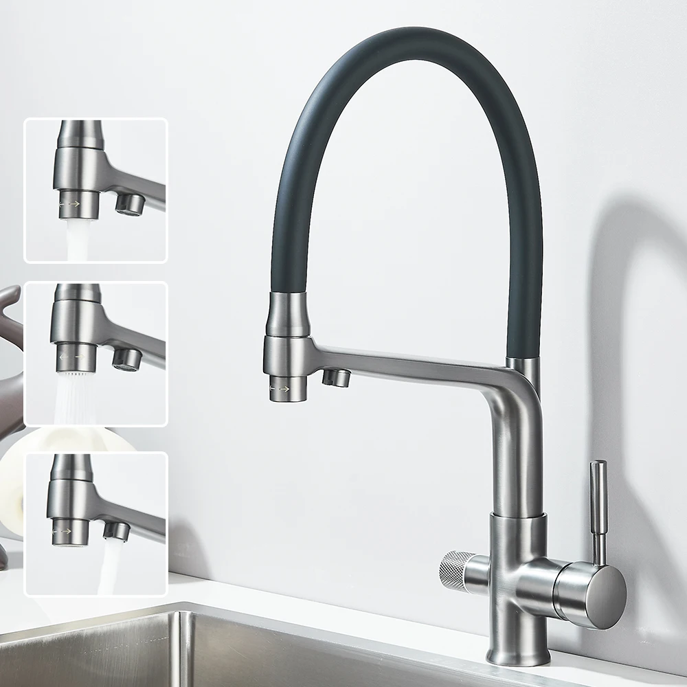 Brushed Gold Kitchen Faucet Filtered Water Dual Spout Purification Feature Kitchen Tap 360 Rotation Water Crane For Kitchen