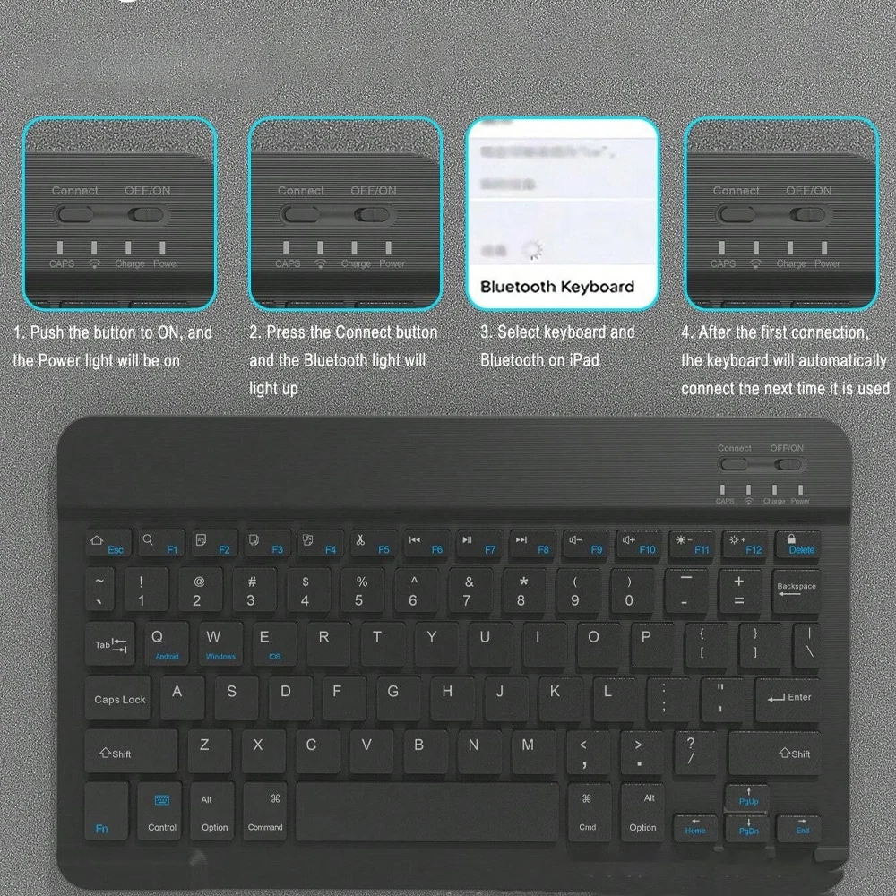 3,Normal Keyboard:Push the switch in the upper right corner to "ON", press "Connect", and find the Bluetooth connection with "Keyboard" in the device Bluetooth list.