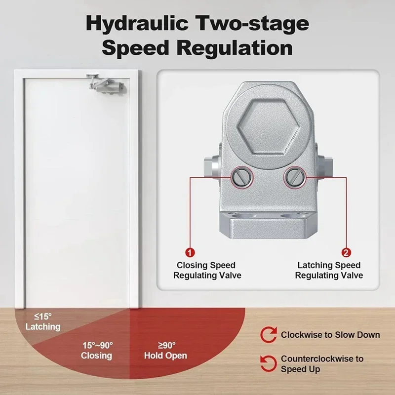 Caractéristique pratique de maintien en position ouverte: notre ferme-porte hydraulique maintient automatiquement la porte au-dessus d'un angle de 90 degrés et la ferme en dessous de ce seuil. Parfait pour faciliter l'accès, améliorer la ventilation et aider à transporter des objets lourds.