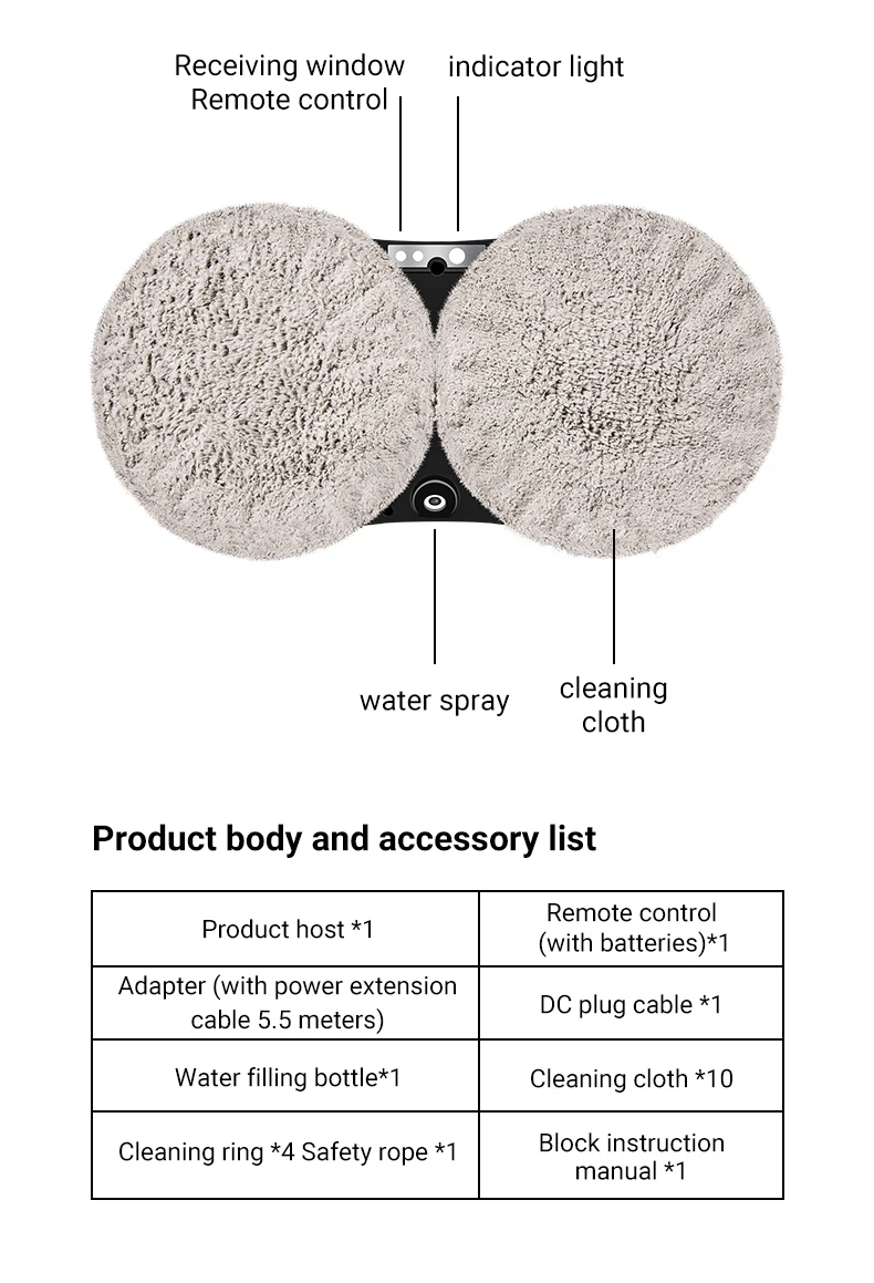 Hey! Friend Please note that this product must be connected to a power source and cannot be recharged. It cannot be used for charging. The battery inside the robot is used to support the safety device and prevent the robot from falling. Power cord + adapter, 1 remote control 2 pairs of cleaning rings (4 pcs) 1 x 4 meter extension pole 1 x 4 meter safety rope 10 cleaning napkins 1 guide (or English guide)