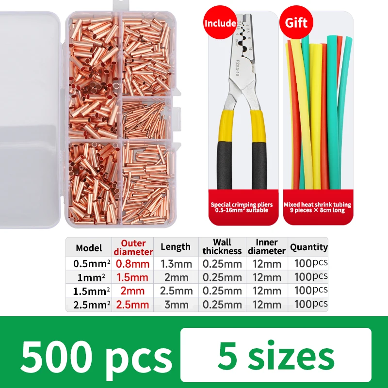 GT Copper Connecting Pipe Wire Joint Small Copper Tube Terminal Cable Lug Bootlace Ferrule Kit with Crimping Pliers Tool