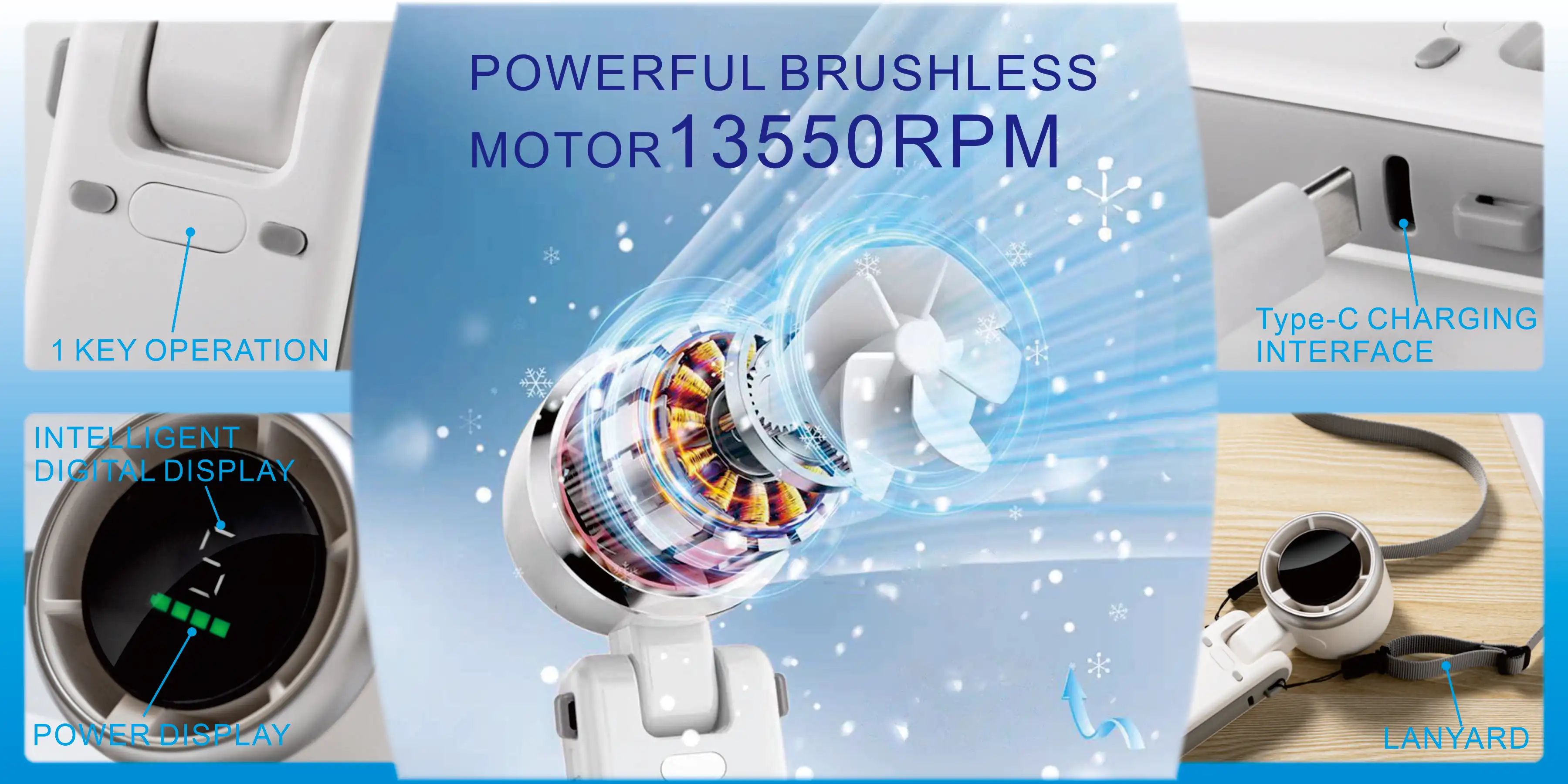 The N607 handheld turbofan adopts an advanced 6-blade design and is equipped with a high-speed three-phase brushless motor, with a maximum wind speed of up to 10m/s. The maximum speed is 13500 rpm, which is three times that of a regular handheld fan. Very suitable for dissipating heat during hot journeys.