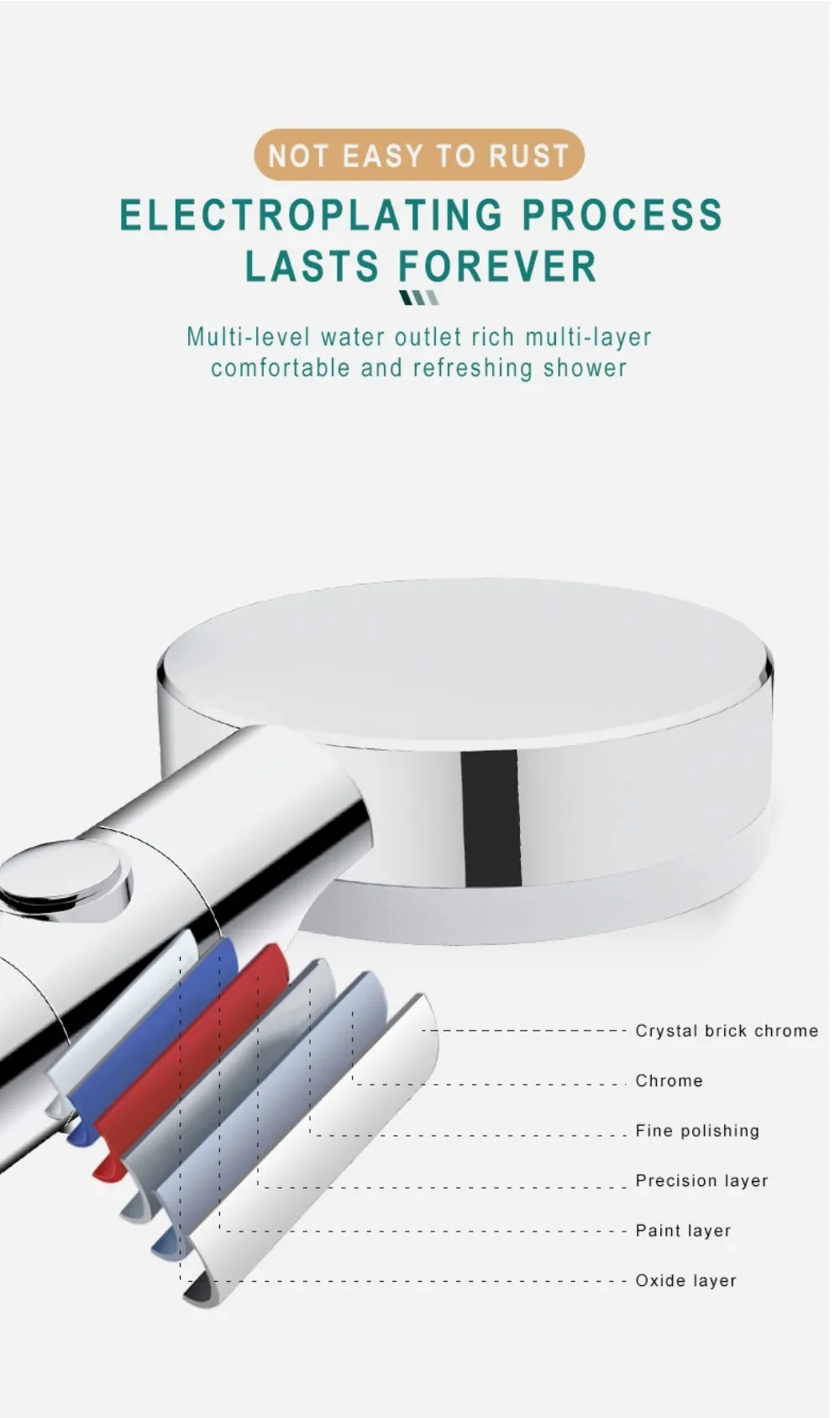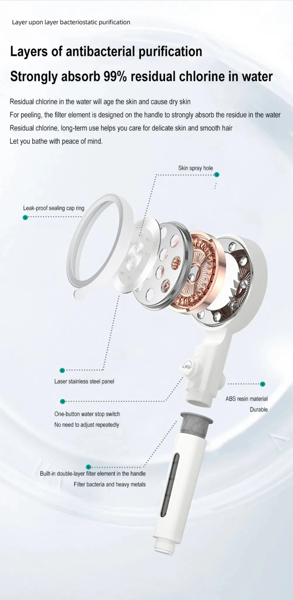 Shower head uses micro nozzle technology makes the outlet holes smaller and denser, increasing the speed of the water flow, At the same time Up to 40% water saving than ordinary shower head.