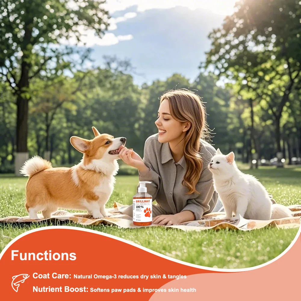 **Nutrient-Dense Formula:** Free from artificial additives, our Salmon Oil is crafted to enhance your pet’s natural beauty, promoting a dazzling glossy coat, softer paws, increased vitality, and improved appetite.