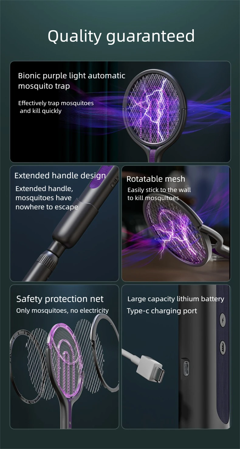 3. High-efficiency rechargeable battery: equipped with a 1200mAh rechargeable battery, our mosquito swatter provides longer service time and longer service life, and can be easily charged through the USB Type-C port