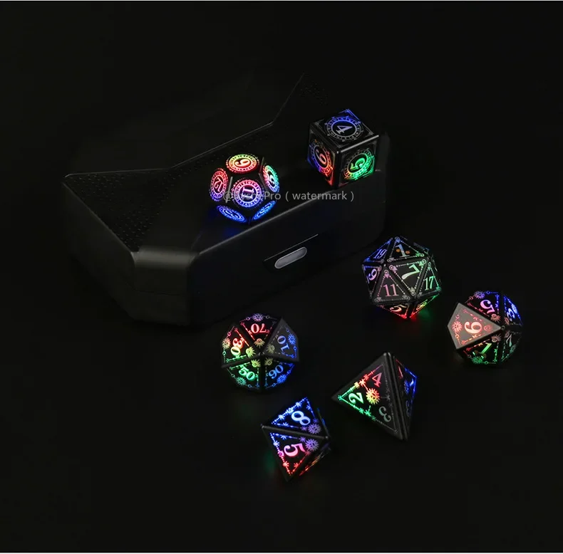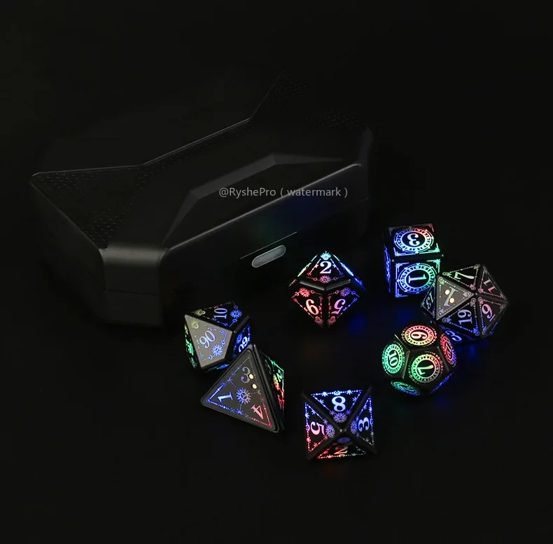 The polyhedral dice set comes with a charging case that