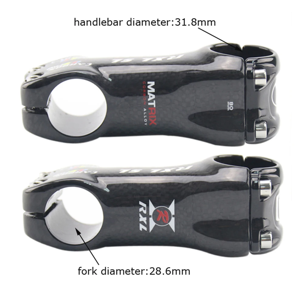 【Durable carbon handlebar stem】 Material: carbon fiber + aluminum alloy (the cap is a high-quality aluminum alloy); Appearance:3K glossy/3K matte/UD matte; Weight: approx. 120~180g; fork diameter: 28.6 mm (1-1/8"), handlebar diameter: 31.8 mm, angle: 6/17°.