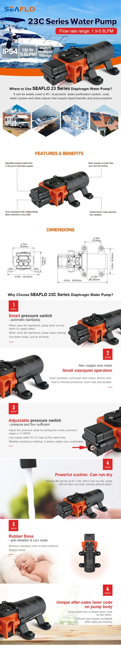 Seaflo 23C Series 1.5GPM/40PSI Automatic Marine Water Diaphragm Pump 12V 24V Self Priming Boat yacht, RV Caravan High Pressure