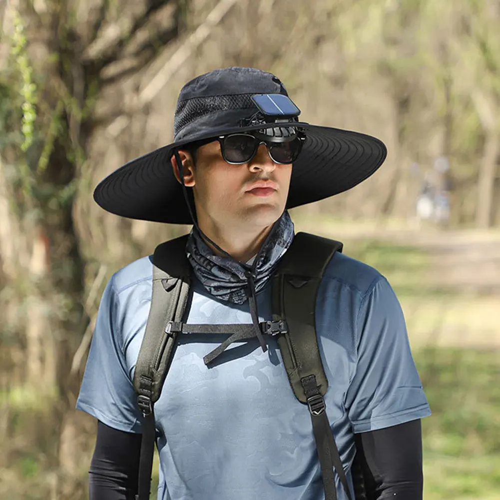 3.Solar & USB Powered for Unlimited Use: Recharge via sunlight (solar panel) or USB (800mAh battery), ensuring continuous use without stopping for charging. Perfect as a wide brim bucket hat.