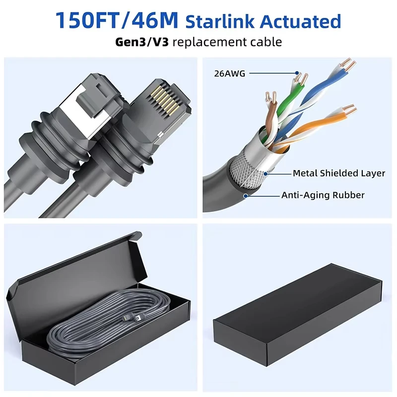 The gen 3/V4 starlink cable 150ft contains 26AWG single-core copper and has a metal shielding layer on the outside to ensure the best connection.